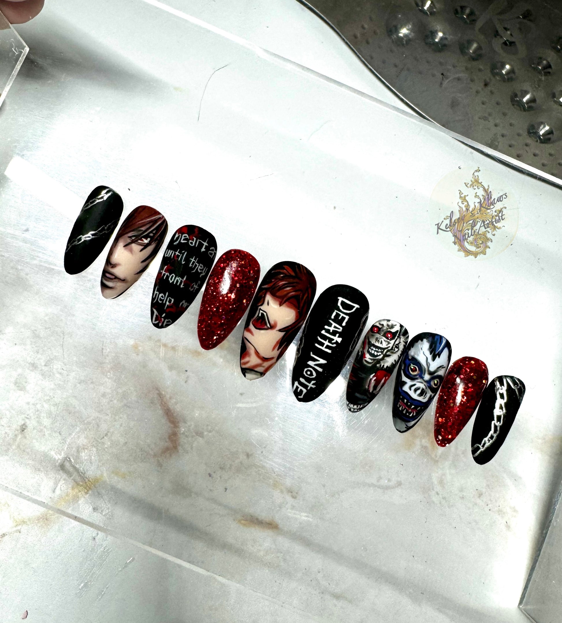 These eerie Death N nails feature 4 hand painted characters and accent nails.