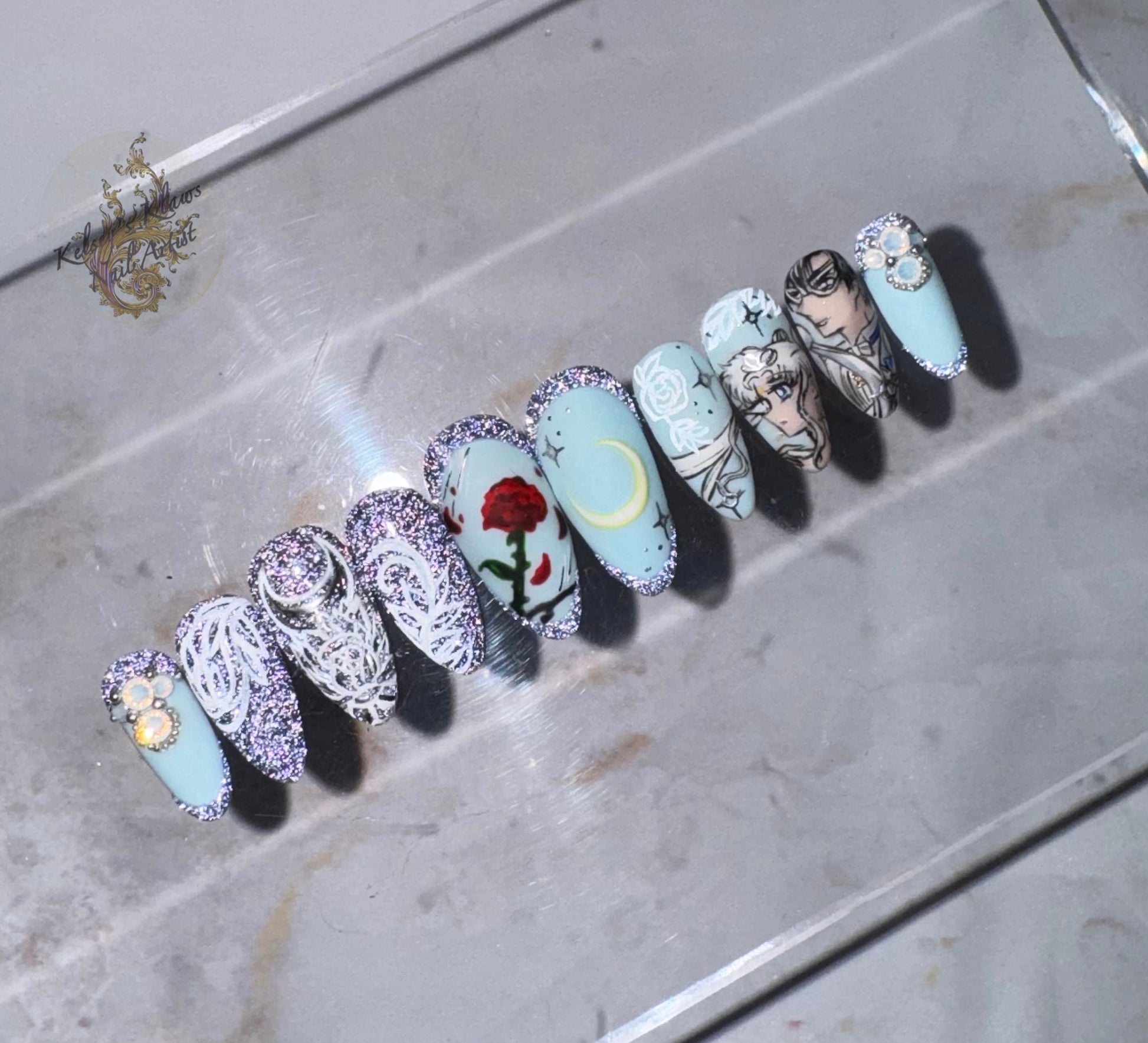 These stunning Sailor M nails feature 2 hand painted characters and accent nails.